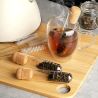 Each infuser, including the cork, measures 3 x 14.5 cm, and is made of transparent borosilicate glass with natural cork lids, giving it an elegant look while preventing the contents from spilling. The set also includes 3 cleaning brushes, each 17 cm long, which help maintain hygiene and ensure the infusers’ durability over time. The clear glass beautifully showcases the tea leaves or herbs, keeping them contained while delivering a clean, flavorful infusion. This versatile set works perfectly for various types of teas and herbal blends, is easy to clean, and, thanks to its stylish design, makes an excellent gift for lovers of aromatic teas.