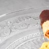 This elegant 25 cm glass cake stand, featuring a decorative pattern, is perfect for serving cakes, pastries, fruits, cookies, and other treats.