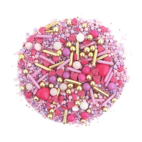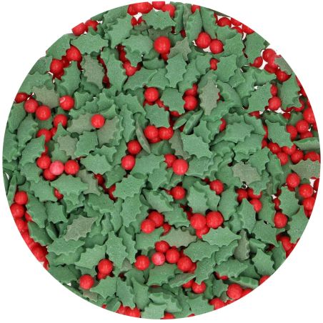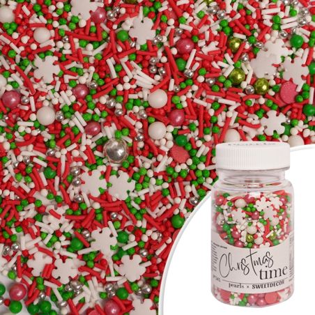 Rudolph's Treat is a festive sprinkle that is sure to bring Christmas charm to your baked goods! The tiny green and white elements resemble a winter landscape, while the large red dragees, with delicious chocolate inside, symbolize the nose of Rudolph's famous reindeer. Golden pearls and delicate snowflakes add sparkle and elegance, creating the perfect finishing touch for your holiday baked goods. The sprinkles are easy to apply, perfect for decorating gingerbread cookies, cupcakes and cakes, creating a magical holiday effect. Add a touch of joy and holiday magic to your sweets.