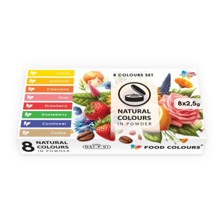 Premium Colours powdered food colorants are a set of 21 vibrant colors that allow for creating impressive decorations in the kitchen. The set includes colorants in yellow, orange, pink, red, purple, blue, navy, green, brown, black, white, cocoa brown, allura red, sugar green, blueberry purple, mint green, chinoline yellow, gold, ruby, copper, and silver. Ideal for coloring desserts, cakes, creams, and many other applications.