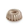 Solidny korpus wykonany ze stopu metali oraz wysokiej jakości powłoka antyadhezyjna w eleganckim, metalicznym kolorze zapewniają równomierne pieczenie bez ryzyka przypalania. Po upieczeniu gotową babkę można łatwo wyjąć z formy, zachowując jej idealny kształt. Zalecane mycie pod bieżącą wodą z dodatkiem płynu do mycia naczyń; możliwość mycia w zmywarce.