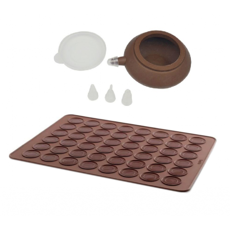 Forma do pieczenia francuskich makaroników. Wykonana została z wysokiej jakości z silikonu odpornego na temperatury do +230°C. Do wypieków makaroników nie potrzeba używać tłuszczu lub mąki. Ciasto nie przywiera do formy i idealnie się z niej wyciąga. Mata silikonowa nie chłonie zapachów oraz nie nasiąka płynami. Zajmuje bardzo mało miejsca, wystarczy ją zwijać lub złożyć. Mata jest gładka, a pierścienie nie zawierają wypukłych brzegów.