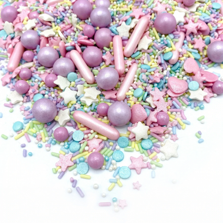Kolorowa posypka stanowiąca wesołą dekorację tortów, deserów i wszelkiego rodzaju ciast. Takie ozdoby sprawią, że Twoje desery będą w centrum zainteresowania i zostaną zapamiętane na dłużej, jako wyrób unikalny. Nadaj swoim słodkim wypiekom blask i niepowtarzalny design.